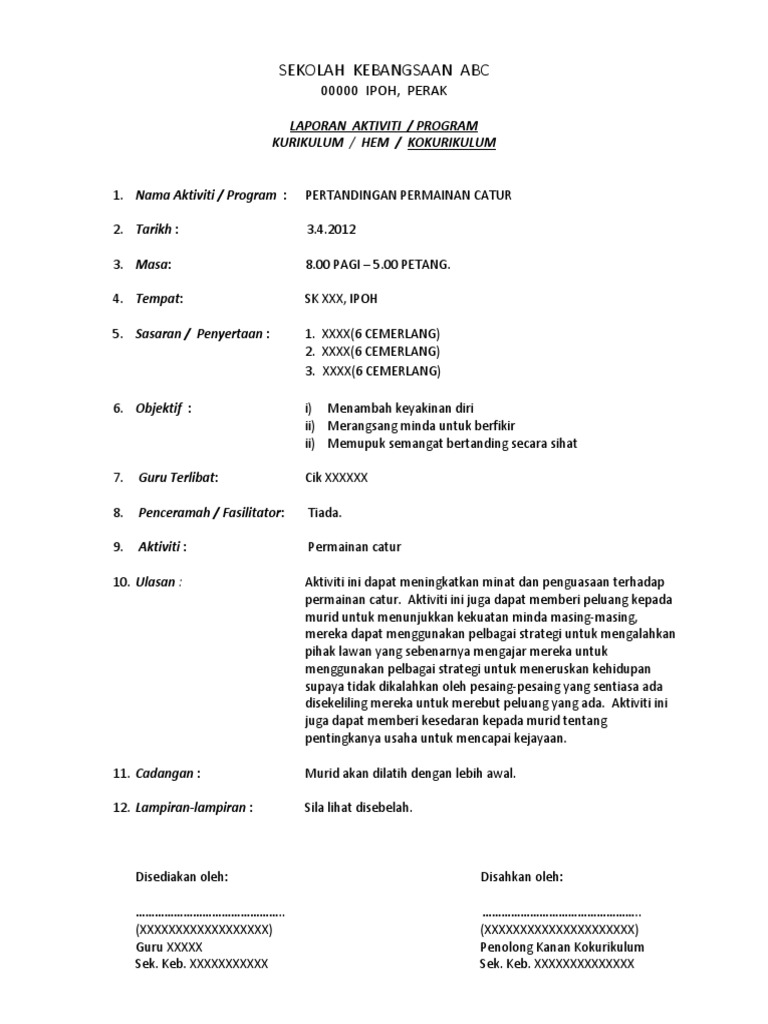 Contoh Laporan Aktiviti Kokurikulum Sekolah Setiap guru penasihat bagi persatuan kelab badan beruniform dan sukan di sekolah perlu membuat laporan untuk setiap. Download View Contoh Laporan Aktiviti Sekolah as PDF for free. Format laporan aktiviti sekolah lolishie.